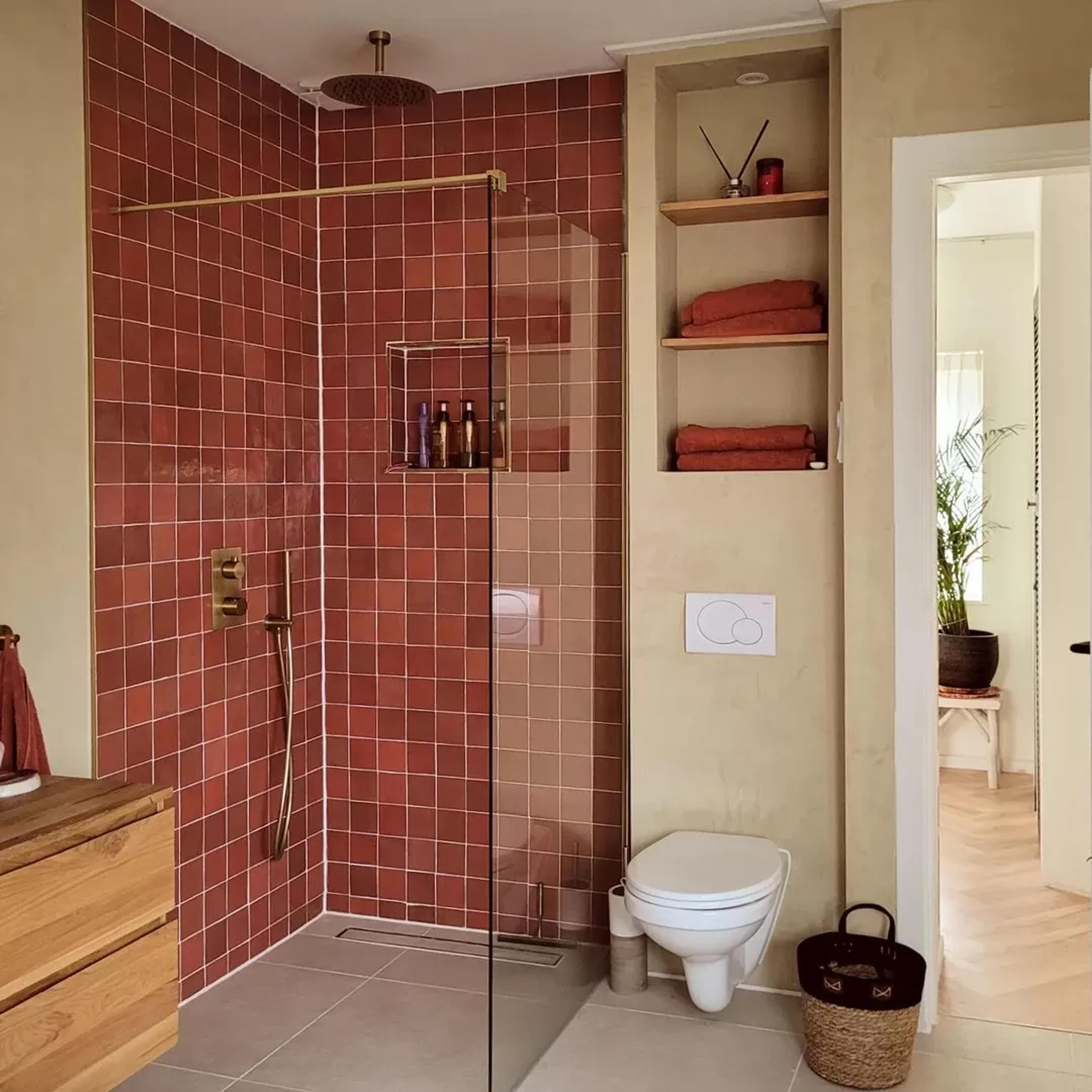 Geniet van je douchemomentje in een grote inloopdouche. Deze inloopdouche heeft een heerlijke regendouche. Van de ruimte is goed gebruik gemaakt met een toilet naast de deur. De badkamer is simpel maar heeft wel luxe accessoires. De nis met douchespullen, de nis met handdoeken en het gouden sanitair maken het erg comfortabel.