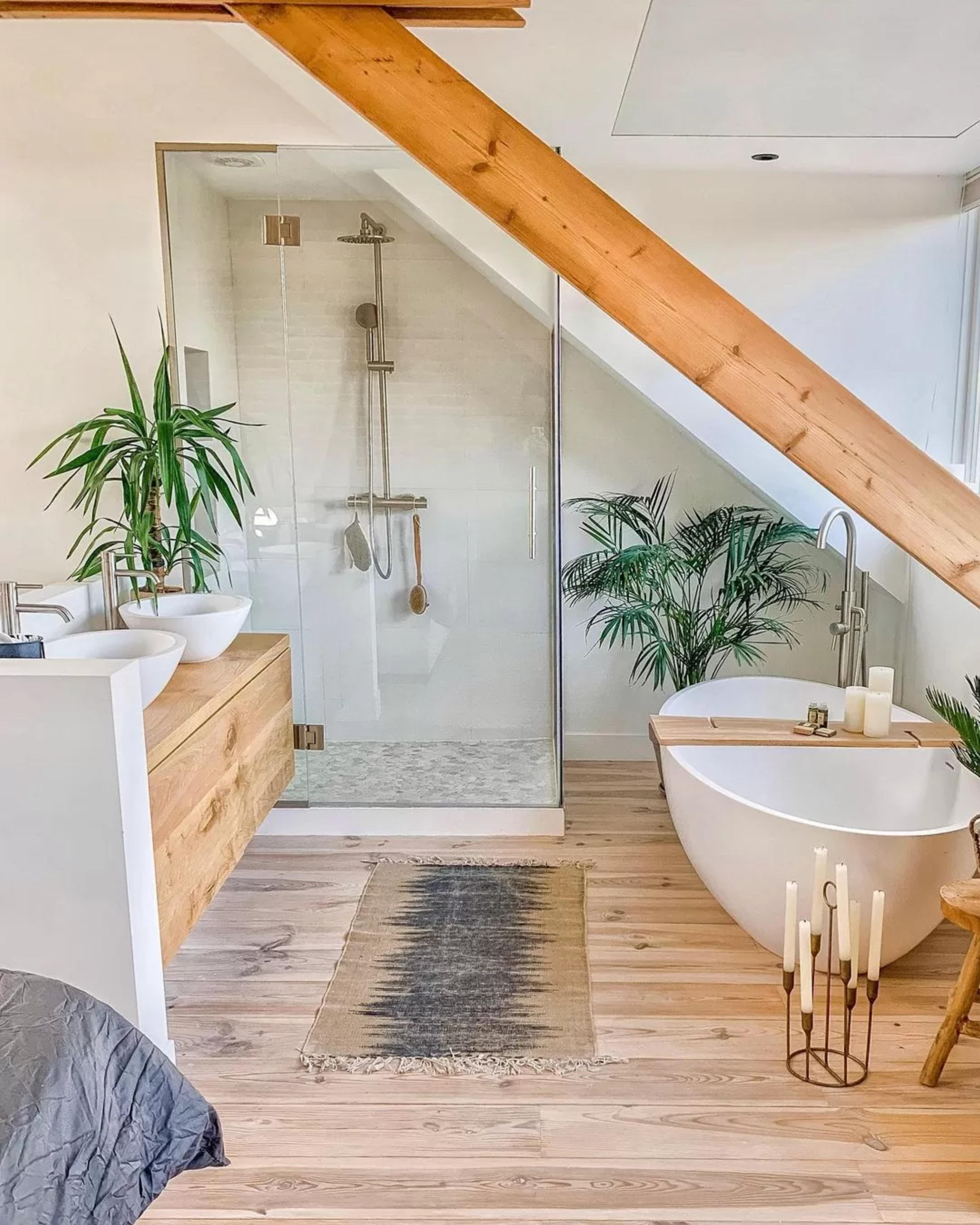 Een warme badkamer bereik je door te kiezen voor een houtlook vloer. Door het vocht is hout geen goede keuze maar keramische parket kan heel goed. Het lijkt heel erg op hout maar is vochtbestendig en gemakkelijk in onderhoud. Er is weinig meer voor nodig om een warme sfeer te creëren.