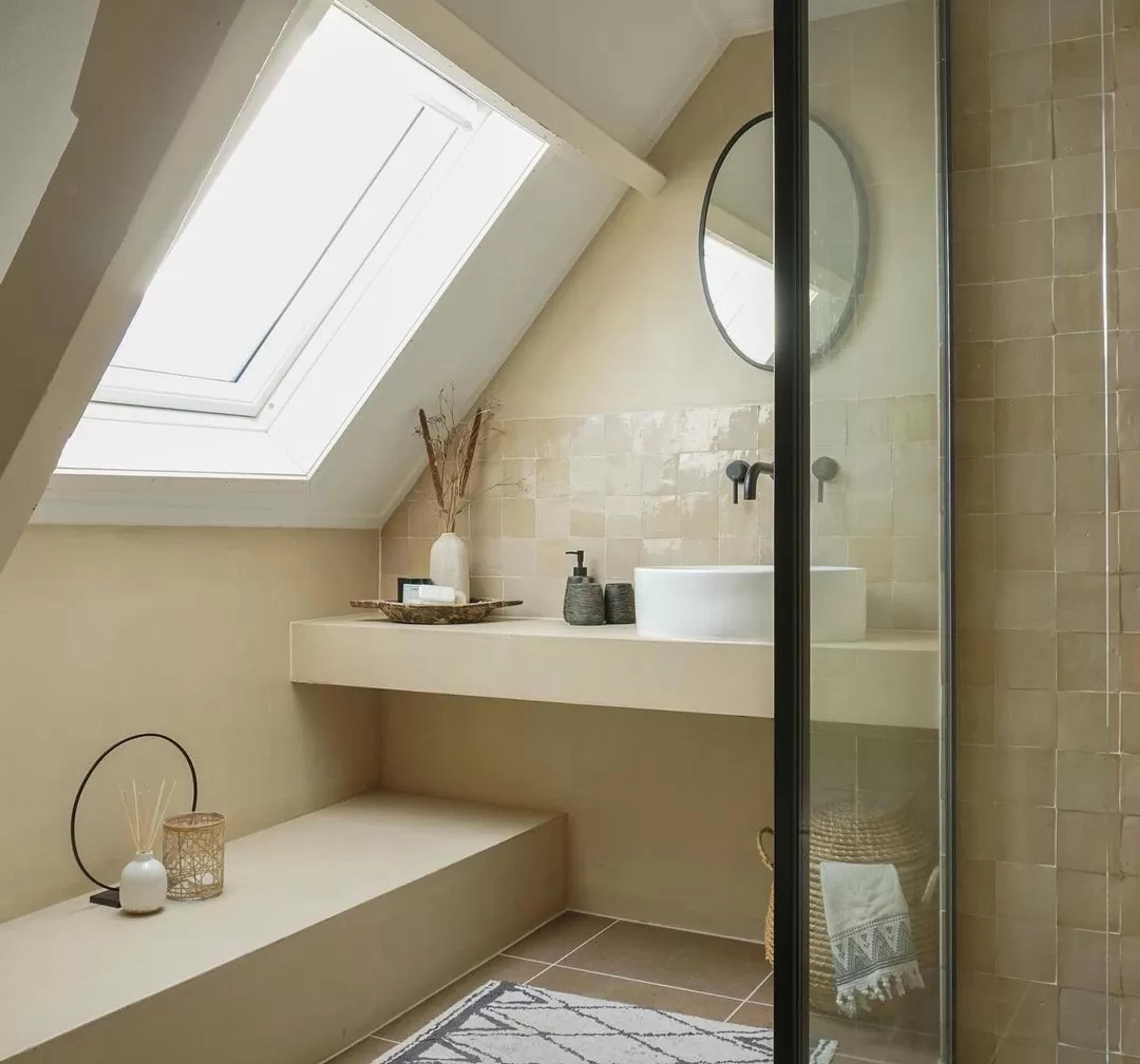 Beton ciré is een mooi materiaal voor de badkamer. Het lijkt op beton of verf maar het is waterbestendig. Hierdoor is het perfect geschikt voor de badkamer. Het is naadloos en heeft daardoor een unieke uitstraling. Zoals je op de foto ziet gemakkelijk te combineren met andere materialen.