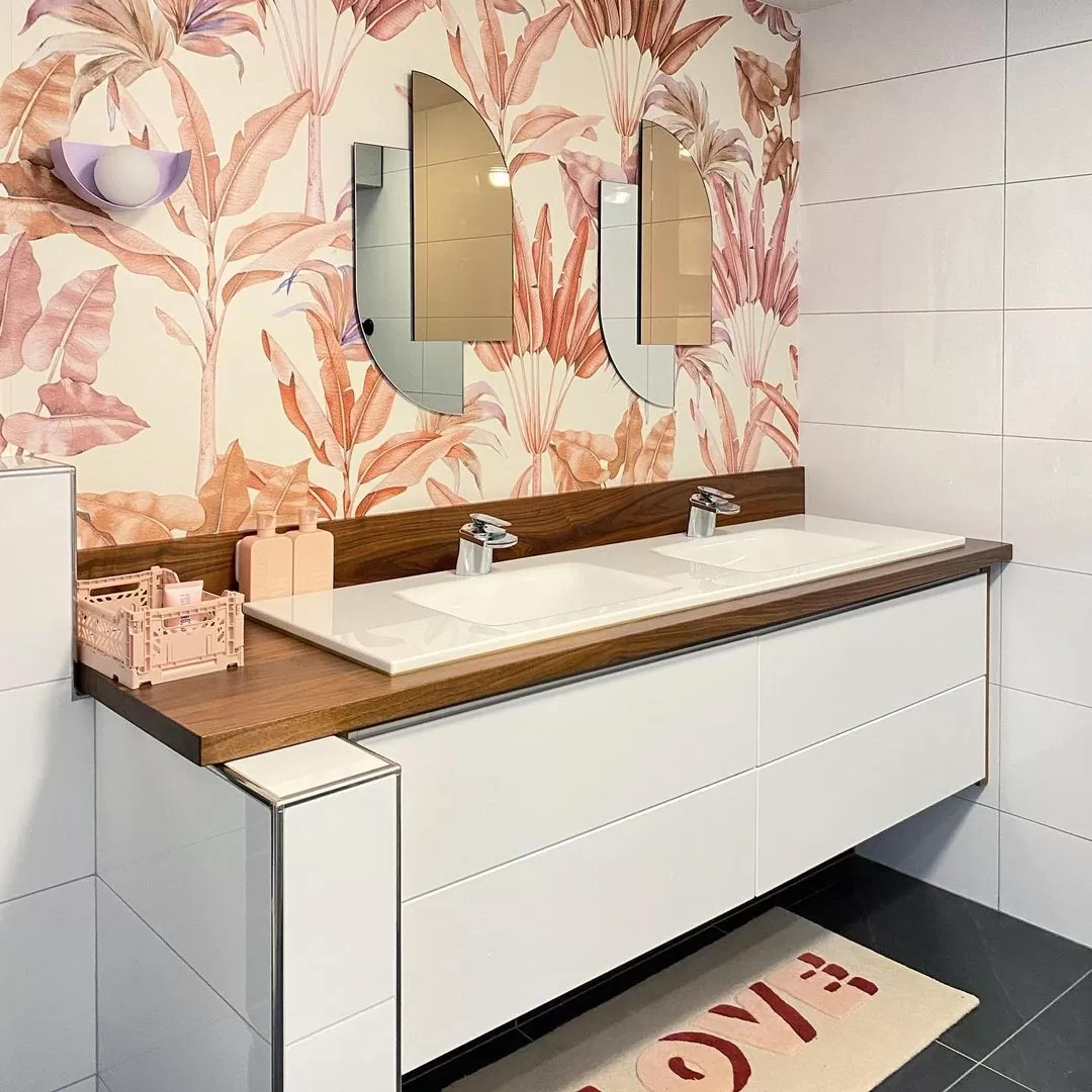 Een dubbele wasbak in de badkamer is luxueus. Het is praktisch om op hetzelfde moment gebruik te maken van de wasbak. Deze inbouw badkamer wasbak zit in een mooi meubel, omrand met donker hout. De muur valt uiteraard meteen op. Kies voor een behangsoort die goed tegen vochtige ruimtes kan.