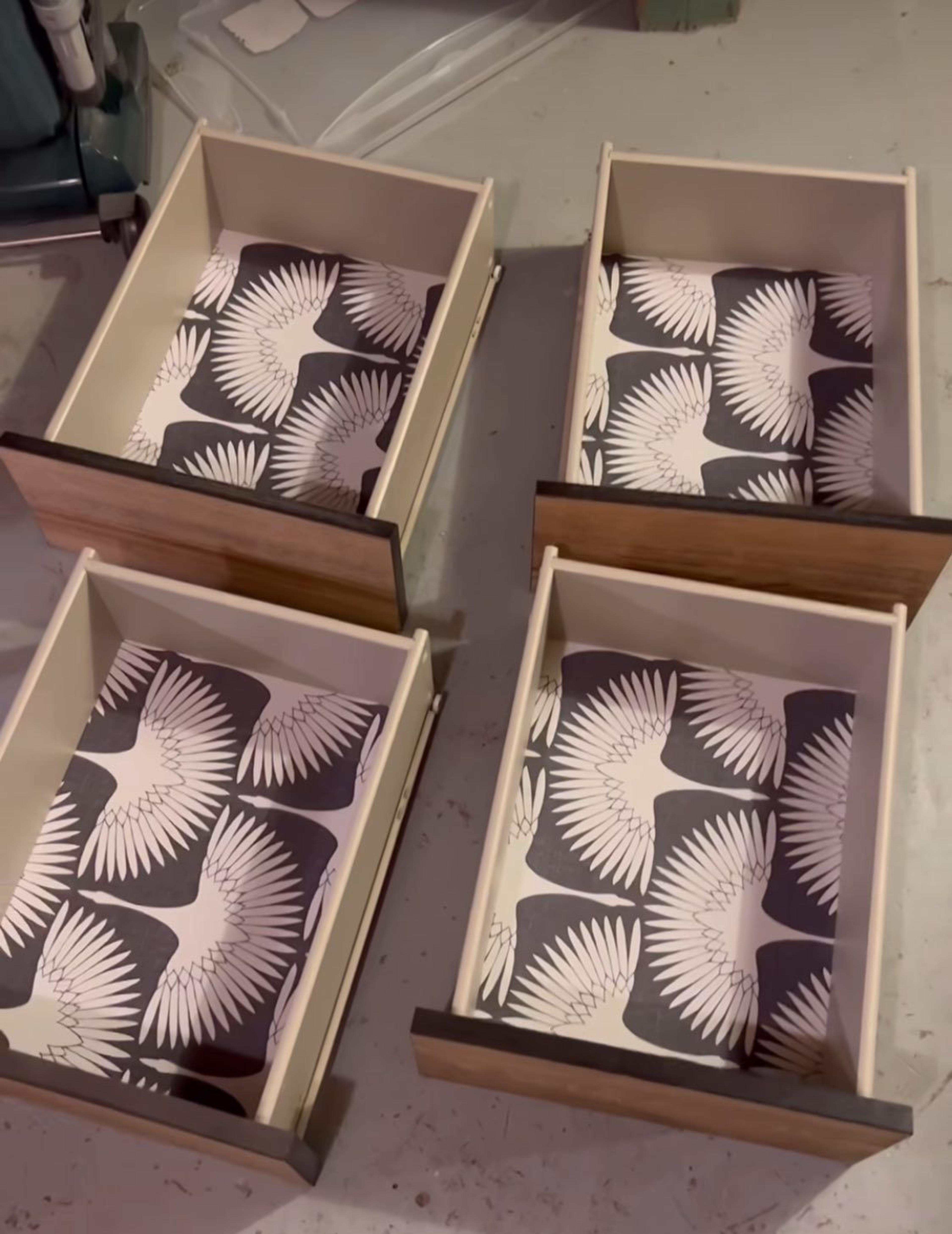 Breng zelfklevend behang aan aan de binnenkant van de laden voor een persoonlijke touch. Kies een ontwerp dat past bij jouw stijl en smaak en breng het eenvoudig aan met het peel and stick ontwerp. Strijk eventuele luchtbellen glad voor een mooi resultaat dat jouw nachtkastjes uniek maakt.