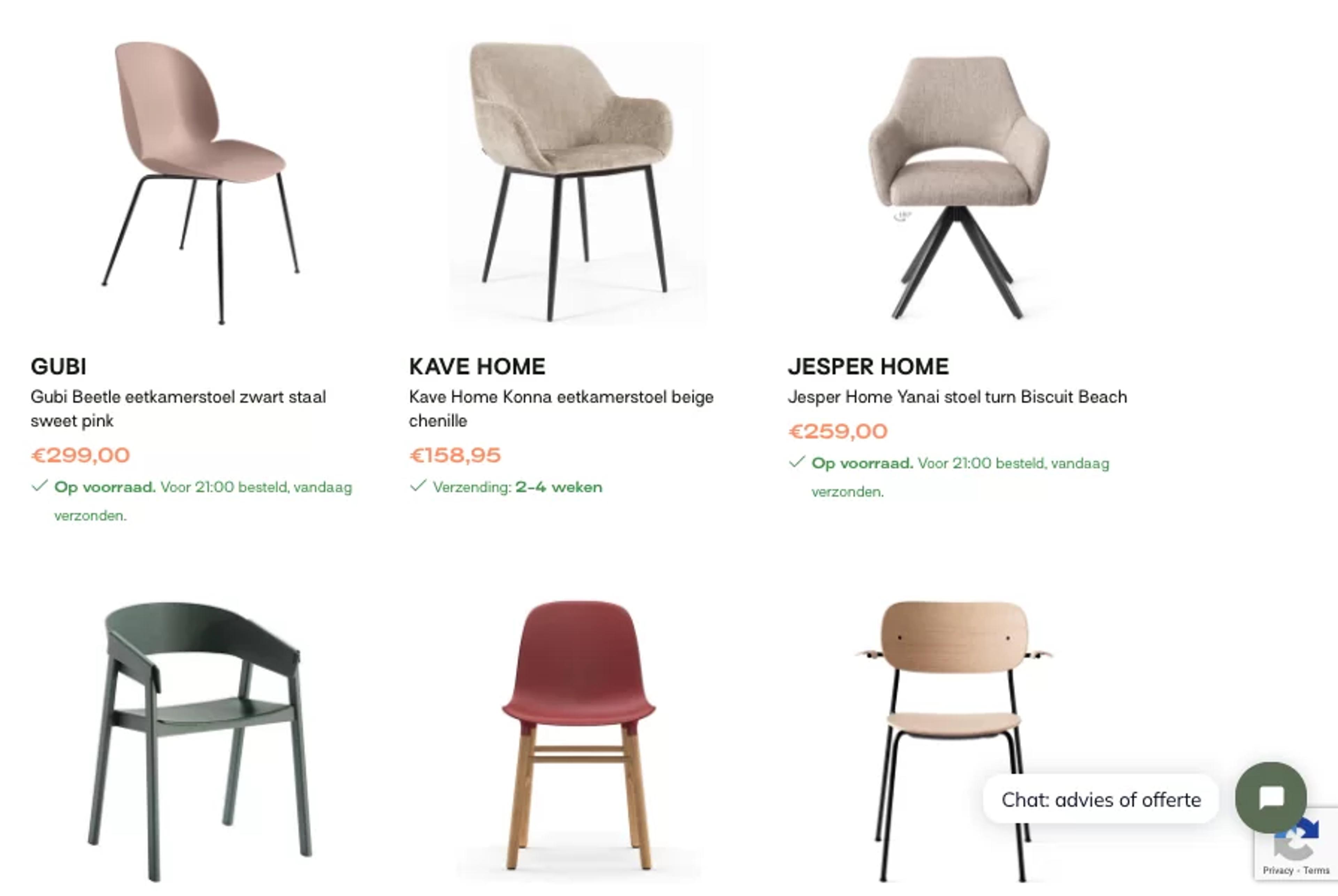 De naam verklapt het al, maar HelloChair dé place to be voor het scoren van mooie stoelen. HelloChair verkoopt online ruim 3000 stoelen en in de winkel kun je ongeveer 300 stoelen bekijken en uittesten. Zo verkopen ze eetkamerstoelen, tuinstoelen, fauteuils, bureaustoelen en loungestoelen in verschillende kleuren, materialen van de zitting en onderstel, met of zonder armleuning en stoffering. Daarnaast is HelloChair van alle markten thuis, aangezien er stoelen worden verkocht in alle woonstijlen die je maar kunt bedenken. Denk aan modern, Scandinavisch, klassiek, retro, landelijk, industrieel en bohemian.