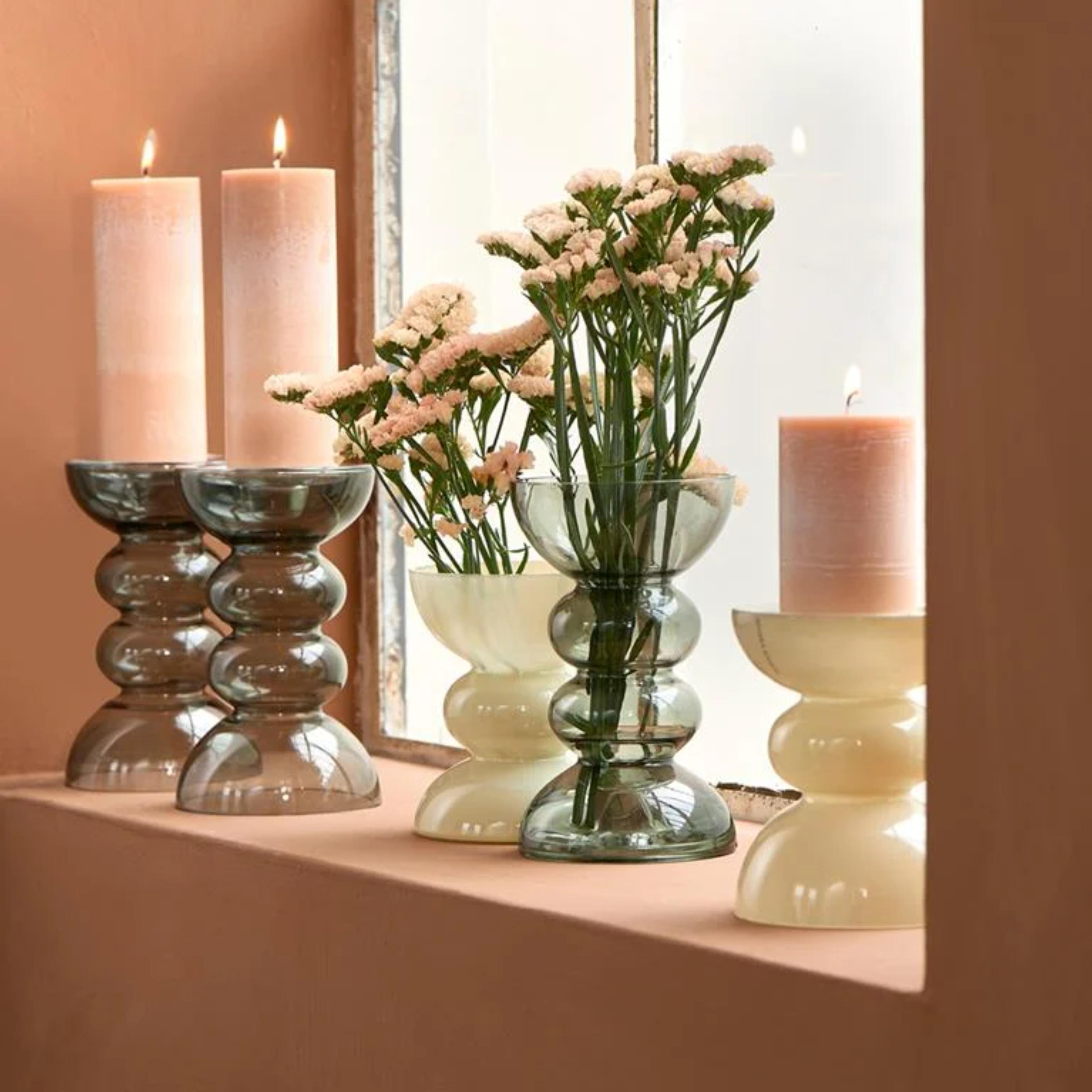 Bruintinten zien we tegenwoordig steeds vaker terug in het interieur, zelfs op het vensterbank. In het voorbeeld zie je een prachtige, slanke vaas in een mooie bruintint waar je een mooie bos bloemen in kwijt kunt. Dankzij de hoge vorm van het vaasje is het ook geschikt voor pampasgras. Gemaakt van mondgeblazen glas en dus uniek ter decoratie!