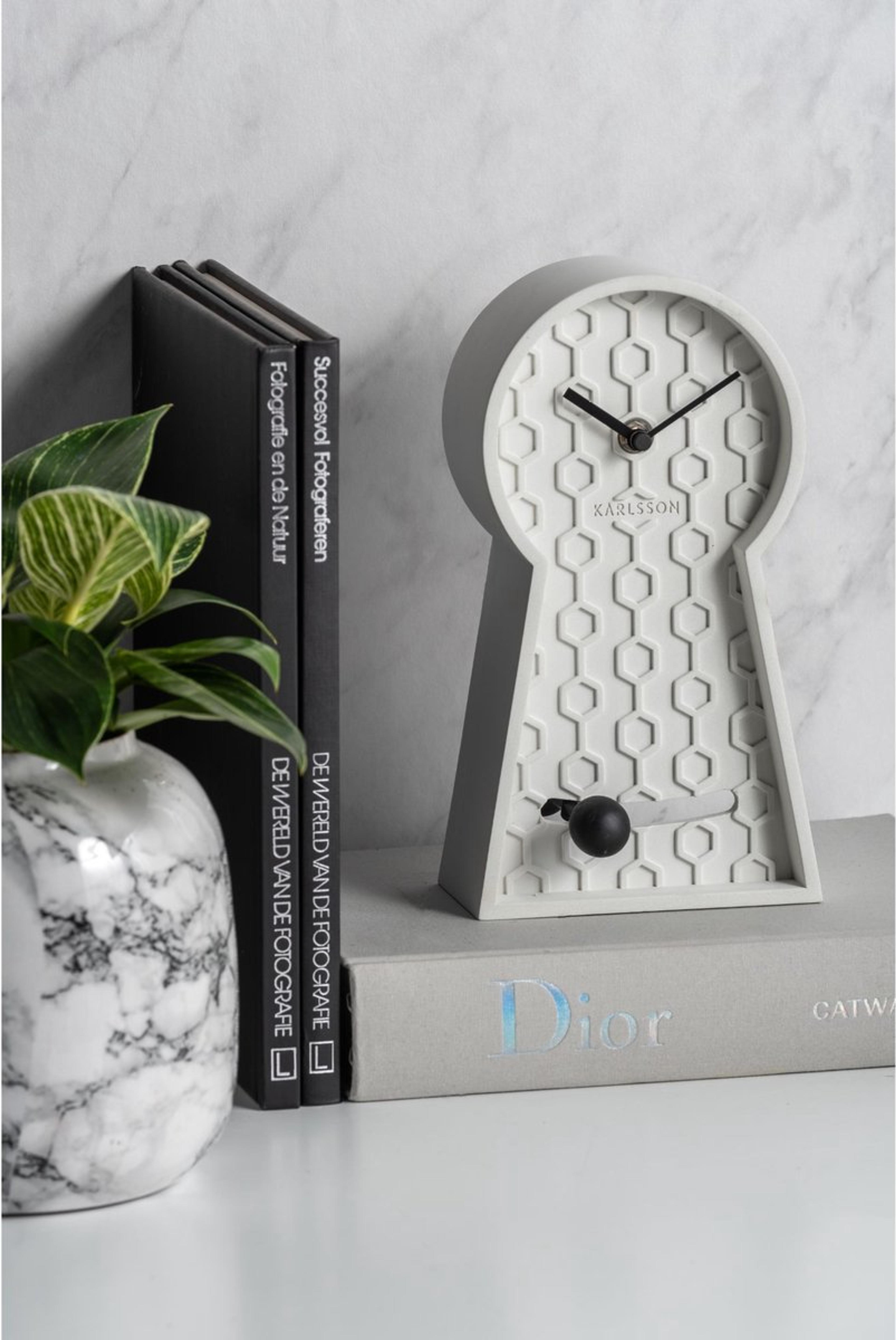 Deze pendulum tafelklok is een echte blikvanger dankzij het honingraatmotief. Bijzonder genoeg is het gemaakt van beton, waardoor het niet snel kapot gaat. Geniet dus jarenlang van deze robuuste tafelklok van h 25 x b 14 x d 6 cm.