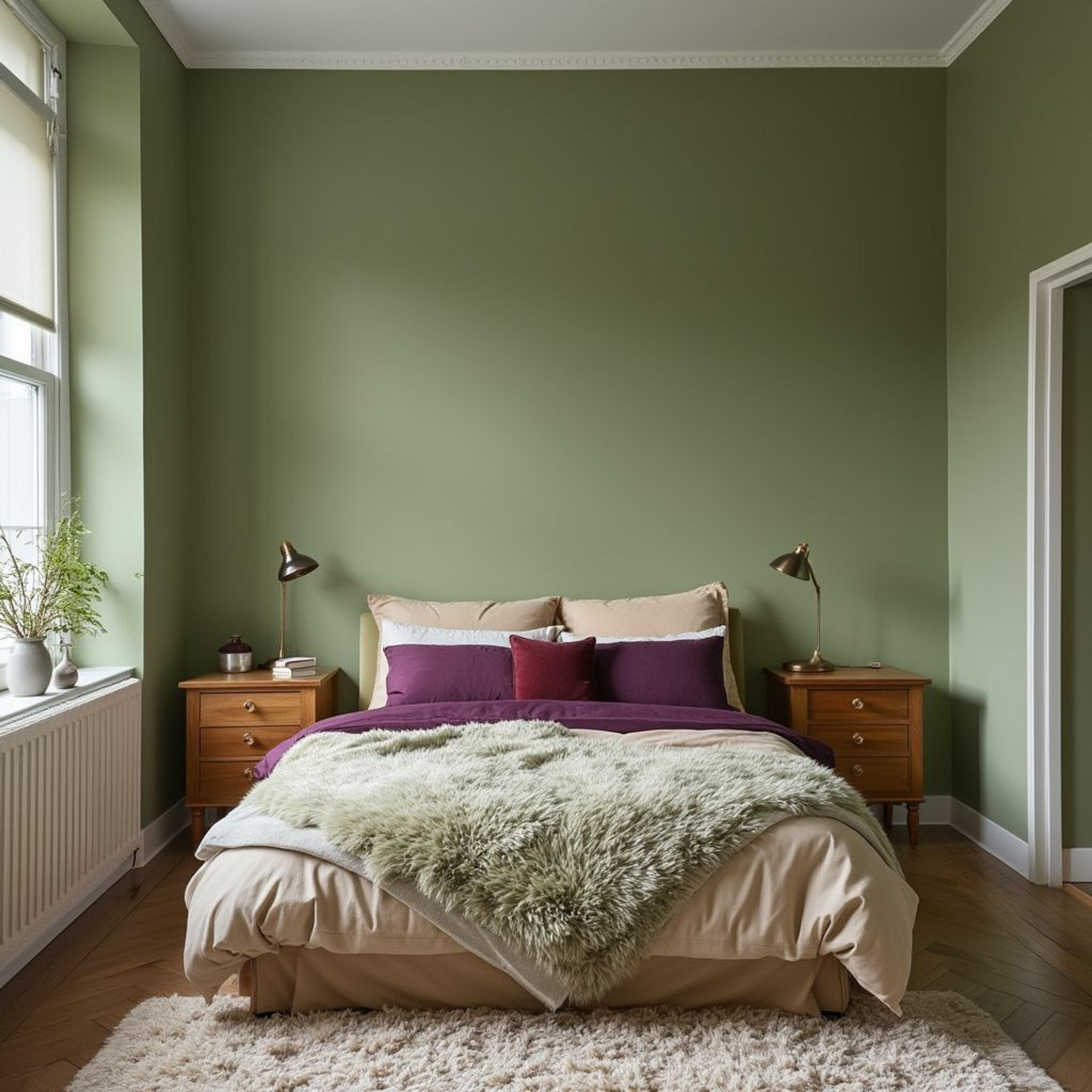 Pistachegroen zit precies tussen een niet te koele en niet te warme groentint in, perfect voor een slaapkamer. Door zijn aanpasbaarheid kun je het wagen om te combineren met gedurfde kleuren zoals pruimpaars en parelgrijs, die ik heb gekozen voor de stoffen.