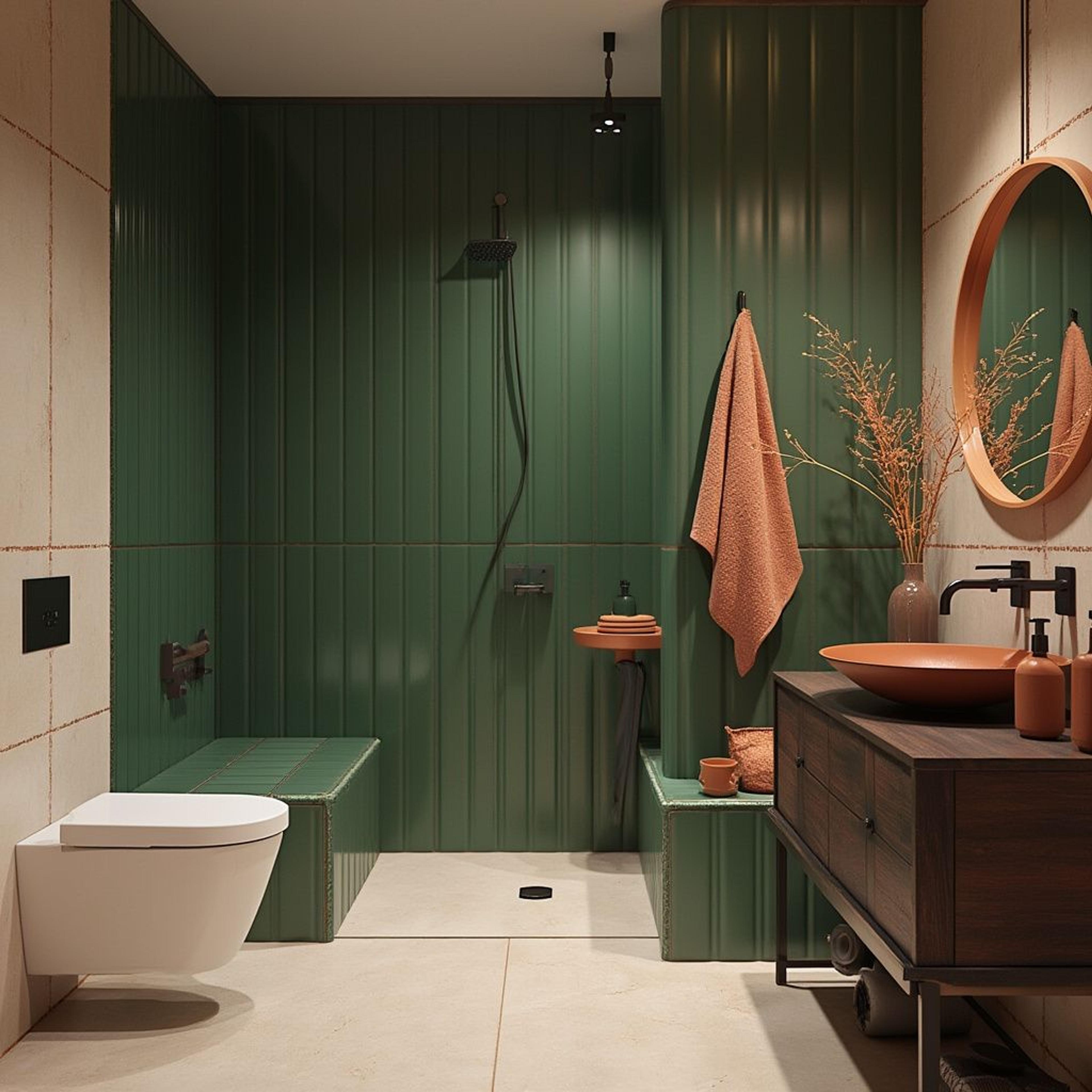 De mosgroene tegels in de doucheruimte balanceren de natuurlijke diepte van het terracotta dat voor accessoires en aanvullende elementen is gebruikt. De donkerhouten wastafel daarentegen maakt de ruimte warmer en geeft ook diepte, wat contrasteert met de typische koelte van het sanitair en de tegels. Ik raad je aan om terracotta te gebruiken voor de grotere textiel en mosgroen in een hoger percentage, waarbij je streeft naar een verhouding van 70% mosgroen en 30% terracotta.
