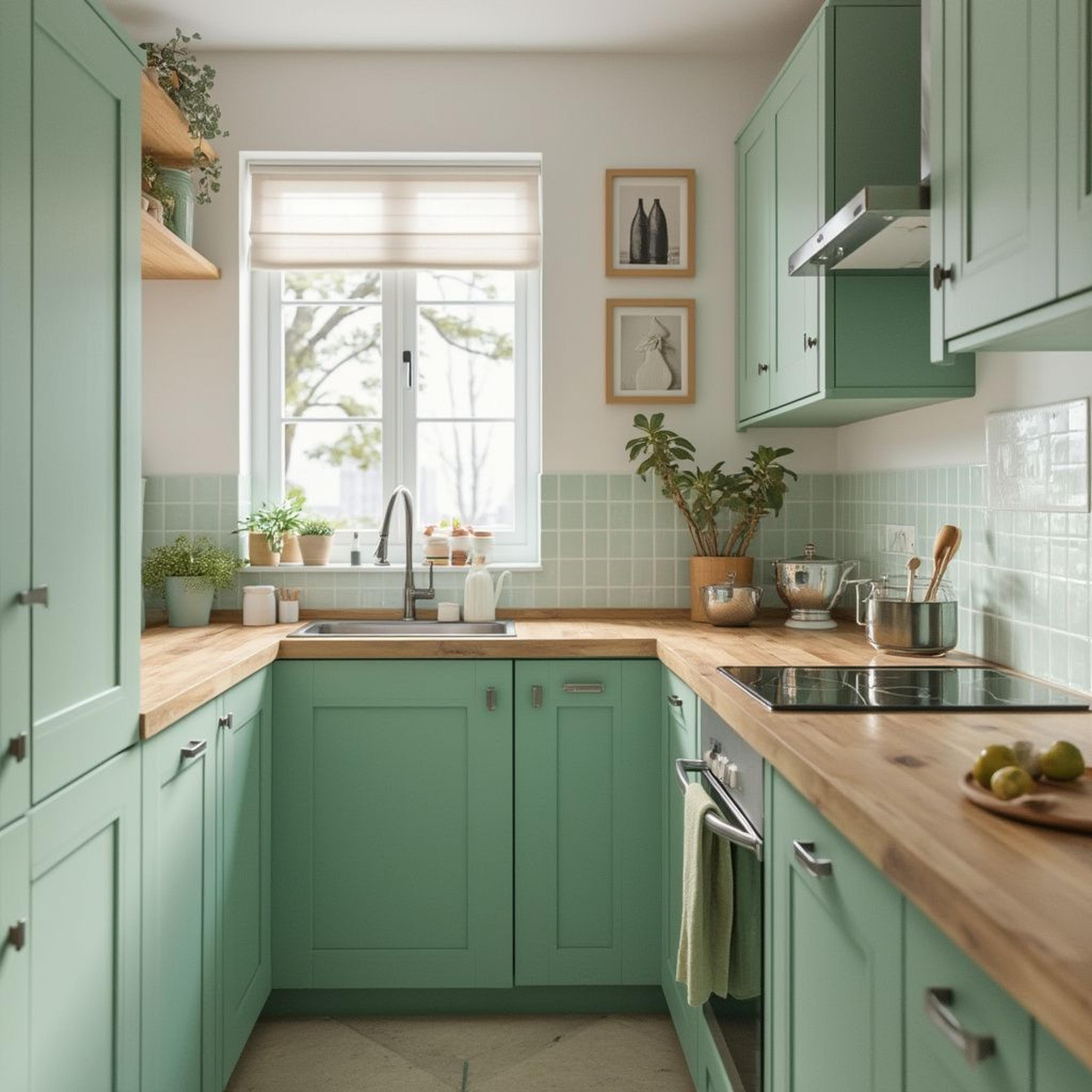 Mintgroen is een lichte tint die zonder twijfel goed werkt met witte muren, zodat je een ruimte creëert die tegelijkertijd gezellig en fris is. Ik heb besloten om het in de keuken te gebruiken en te combineren met een licht houten werkblad.